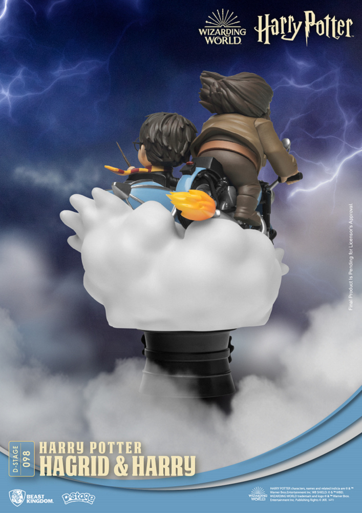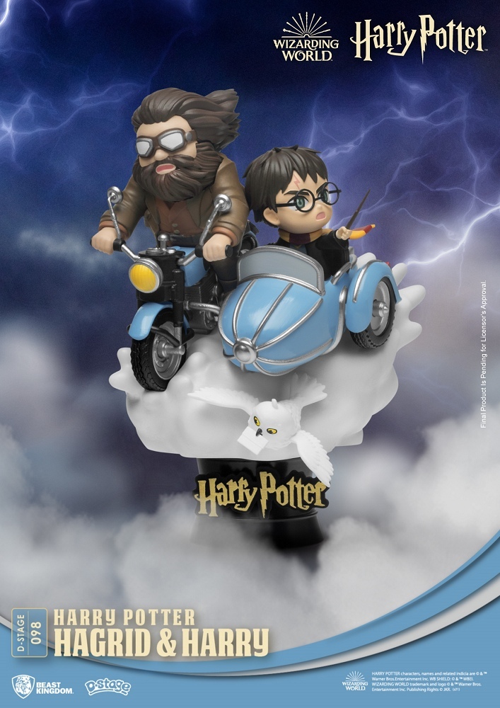 將《哈利波特-死神的聖物1》中,成群「食死人」(Death Eater)與兩人騎著飛天摩托車驚險的追逐橋段經典呈現,但此次以哈利圍著葛萊芬多紅黃相間的圍巾與學院袍,高舉魔杖準備攻擊迎面而來的食死人,而海格魁武的體態也忠實還原,雙手緊握摩托車把手,護目鏡、服裝的細節也都考究劇中服裝,同時嘿美展翅翱翔天際的動作、哈利與海格飛揚的圍巾及毛髮更加強收藏整體的躍動感!